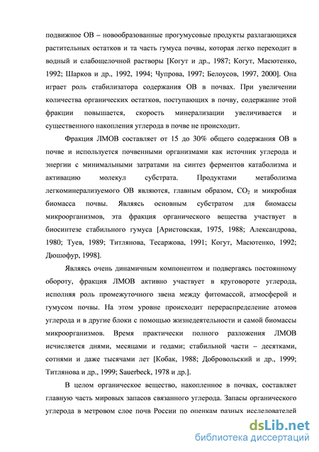 Фракция ЛМОВ составляет от 15 до 30% общего содержания ОВ в почве и используется почвенными организмами как источник углерода и энергии с минимальными затратами на синтез ферментов катаболизма и активацию молекул субстрата. Продуктами метаболизма легкоминерализуемого ОВ являются, главным образом, СО2 и микробная биомасса почвы. Являясь основным субстратом для биомассы микроорганизмов, эта фракция органического вещества участвует в биосинтезе стабильного гумуса [Аристовская, 1975, 1988; Александрова, 1980; Туев, 1989; Титлянова, Тесаржова, 1991; Когут, Масютенко, 1992; Дюшофур, 1998].