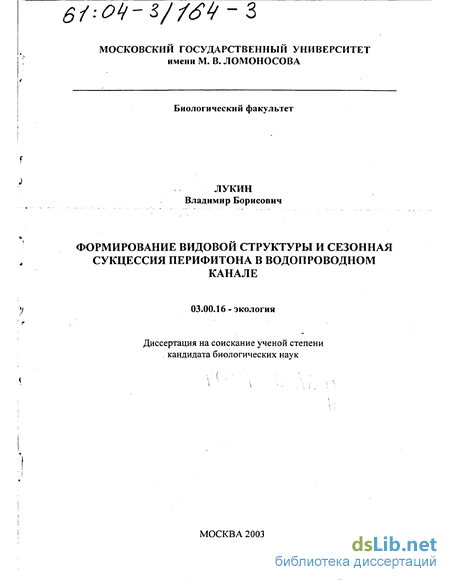 Перифитон, развивающийся на искусственном субстрате в условиях проточного водоема, служит удобной моделью для исследования различных механизмов регуляции видовой структуры сообщества. С одной стороны, для образующих его организмов наиболее важным ресурсом является свободное пространство, а конкуренция за него может служить основным фактором, формирующим облик данного сообщества (Fagestrom, 1997). С другой стороны, видовая структура перифитона зависит от [рстоянно происходящего между субстратом и толщей воды обмена организмами. Оценить степень этой зависимости можно, сравнивая видовой состав и соотношение обилия разных видов в планктоне и перифитоне. Увеличение сходства видового состава этих сообществ свидетельствует об усилении влияния существующих между ними обменных процессов, а уменьшение - об усилении роли факторов, специфических для каждого сообщества. Среди последних для видовой структуры перифитона наибольшее значение имеют межвидовая конкуренция за субстрат и пресс фитофагов. з Цель работы - определить механизмы формирования и поддержания видовой структуры перифитона, развивающегося в водопроводном канале, и установить, при каких условиях видовая структура сообщества определяется прежде всего составом оседающих на субстрат планктонных форм, а при каких - взаимодействиями между уже осевшими организмами.