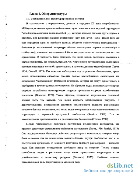 Актуальность проблемы. Изучение механизмов формирования и поддержания видовой структуры сообществ - традиционная, но по-прежнему актуальная тема экологических исследований, выполненных за последние десятилетия (Sommer, 1989; Cornell, Lawton, 1992). Принято считать, что на ранних этапах сукцессии соотношение видов определяется прежде всего их поступлением из внешней среды (Patrick, 1975), а после того как все доступные для колонизации участки местообитания заселены, между колонистами возникают конкурентные взаимодействия, которые и являются основным механизмом, поддерживающим структуру сообщества (Diamond, 1975).