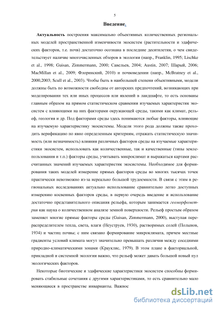 Эти примеры проявившегося в литературе критического отношения к моделям почв и растительности с неправомерно большой долей случайности свидетельствовали о том, что роль и значение факторов среды в пространственной и временной организации экосистем явно недооценивались. В такой ситуации методы предсказательного моделирования потенциально позволяли пролить свет на то, насколько в действительности тесна связь биотических характеристик экосистем с факторами среды. Однако, исследования по экологии за рубежом (обзоры: Franklin, 1995; Guisan, Zimmermann, 2000; Wimberly, Spies, 2001; Austin, 2002; Guisan et al., 2002; Lehmann et al., 2002a; Miller, 2005; Elith et al., 2006; Austin, 2007; Dormann et al., 2007; MacMillan et al., 2009) и в России (Савельев, 2004) нередко приводили к анализу только упрощенных бинарных характеристик экосистем (наличие/отсутствие данного вида организмов или горизонта почв в данном месте), что означало существенную потерю информации (ср. информацию о наличии/отсутствии ели в данном месте с информацией о том, как много в этом месте елей), а потому и низкую тесноту статистических связей. Непрерывные характеристики экосистем и почв в этом плане более информативны, и в настоящем исследовании изучаются в основном такие. Кроме того, нечасты исследования, в которых реально оценивалась бы статистическая значимость каждого из факторов среды; авторы часто ограничиваются оценкой общей значимости модели (это значит, что хотя бы один из факторов среды в ней значим). Оценка значимости каждого из вошедших в модель факторов среды также делается в настоящем исследовании.