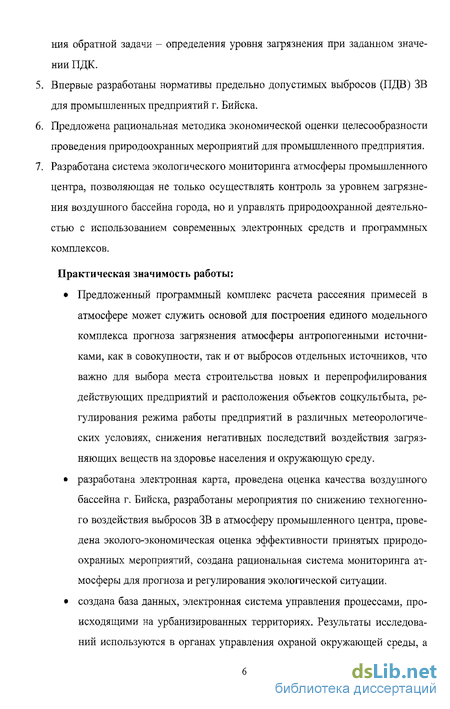 Предложенная система мониторинга атмосферы промышленных центров, позволяющая осуществить контроль и управление уровнем загрязнения приземного слоя, оценить экономическую эффективность предложенных природоохранных мероприятий, отслеживать изменение состояния воздушного бассейна в связи и изменениями качественных и количественных характеристик выбросов, прогнозировать качество атмосферного воздуха при изменении ме- теоусловий, планировать градостроительные мероприятия, выдавать данные по загрязнению воздушной среды в заданной точке территории города. 4. Разработанная система экономической оценки эффективности природоохранных мероприятий, позволяющая определить целесообразность их проведения на предприятии по любому ЗВ.