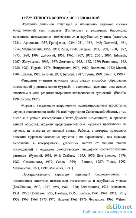 Изучению динамики популяций и изменению видового состава представителей сем. муравьев (Formicidae) в различных биоценозах посвящены исследования отечественных и зарубежных ученых (Алпатов, 1924; Арнольди, 1937, Гринфельд, 1939; 1951, 1957, 1968; Gosswald, 1951, 1954; Мариковский, 1956, 1957; Zahn, 1958; Захаров, 1963, 1968, 1968а, 1972, 1975, 1980, 1999; Длусский, 1965, 1965а 1967, 1975, 2001, 2004; Edwards, 1967; Жигульская, 1969, 1977; Демченко, 1975, 1978, 1979; Резникова, 1975, 1980, 1983; Higashi, 1976; Дмитриенко, 1976, 1982; Boomsma, 1982; Малий, 1984; Брайен, 1986; Берман, 1987; Бугрова, 1987; Губин, 1991; Punttila, 1994).