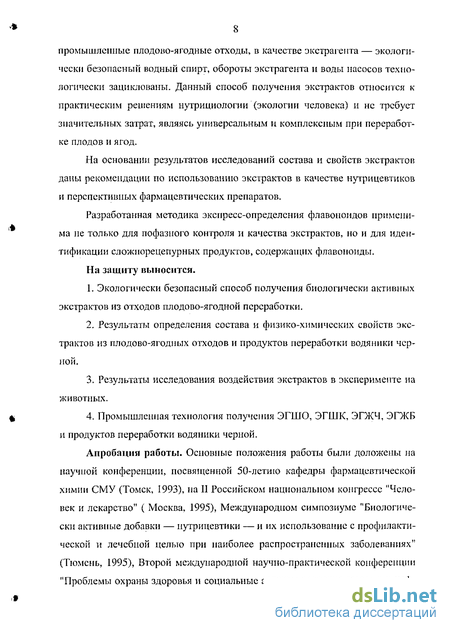 Несомненное практическое значение имеет разработка экологически безопасной промышленной технологии получения биологически активных экстрактов из отходов плодово-ягодной переработки и продуктов переработки водяники черной. Предложенный способ получения соответствует современным требованиям "чистых технологий": в качестве сырья используются