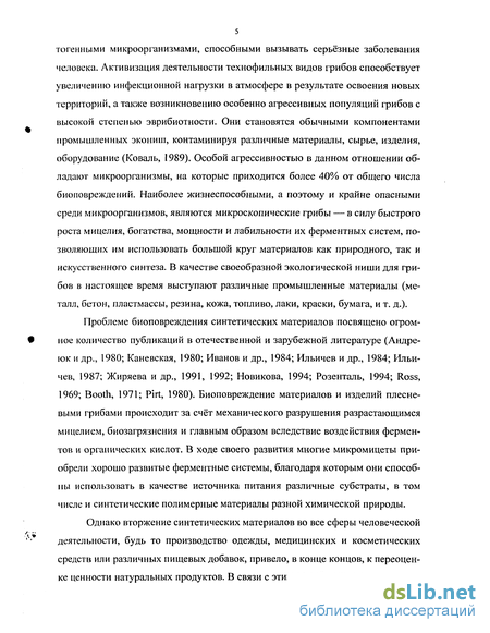 юк и др., 1980; Каневская, 1980; Иванов и др., 1984; Ильичев и др., 1984; Ильичев, 1987; Жиряева и др., 1991, 1992; Новикова, 1994; Розенталь, 1994; Ross, 1969; Booth, 1971; Pirt, 1980). Биоповреждение материалов и изделий плесневыми грибами происходит за счёт механического разрушения разрастающимся мицелием, биозагрязнения и главным образом вследствие воздействия ферментов и органических кислот. В ходе своего развития многие микромицеты приобрели хорошо развитые ферментные системы, благодаря которым они способны использовать в качестве источника питания различные субстраты, в том числе и синтетические полимерные материалы разной химической природы.