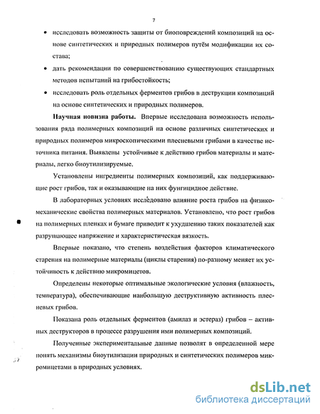 Научная новизна работы. Впервые исследована возможность использования ряда полимерных композиций на основе различных синтетических и природных полимеров микроскопическими плесневыми грибами в качестве источника питания. Выявлены устойчивые к действию грибов материалы и материалы, легко биоутилизируемые.