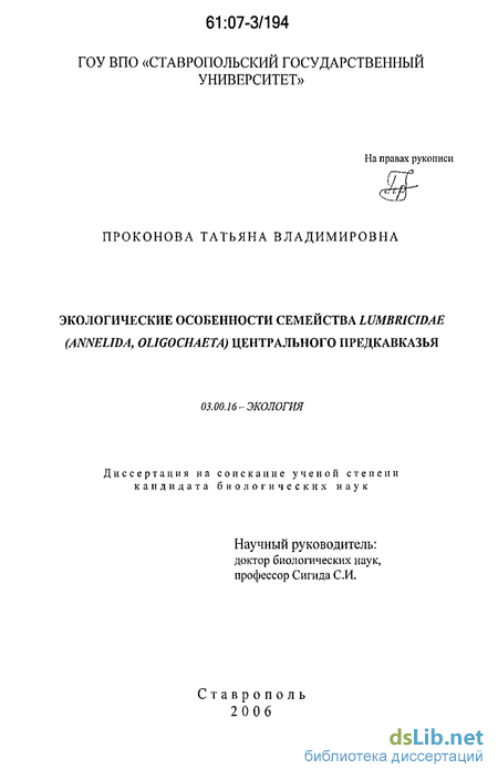 Объект исследований. Объектом исследований являлись почвенные олигохеты семейства Lumbricidae в биотопах, относящихся к одиннадцати почвенным типам, сформировавшимся на территории Центрального Предкавказья.
