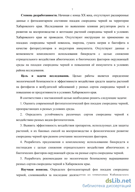 Степень разработанности. Начиная с конца XX века, отсутствуют расширенные данные о фитосанитарном состоянии посадок смородины черной на территории Хабаровского края. Исследования по выявлению влияния регуляторов роста и развития на воспроизводство и вегетацию растений смородины черной в условиях Хабаровского края не проводили. Отсутствуют инструкции по применению на посадках смородины черной новосила, энергена, гумата натрия и бактофита в качестве фиторегуляторов и индукторов иммунитета. Отсутствуют данные о возможности комплексного использования биосредств с целью снижения отрицательного воздействия абиотических и биотических факторов окружающей среды на посадки смородины черной и повышения её иммунитета в условиях района исследования.