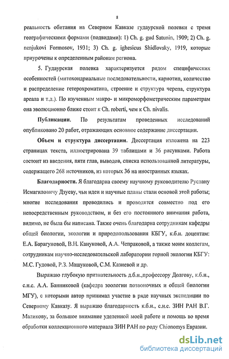 практических совещаниях: Северокавказская региональная научная конференция студентов, аспирантов и молодых ученых «Перспектива-99» (Нальчик, 1999), XXXVII Международная студенческая конференция (Новосибирск, 1999), Региональная научная конференция студентов, аспирантов и молодых ученых Северного Кавказа «Кавказ-2000» (Нальчик, 2000), Региональная научная конференция «Проблема биологического разнообразия Северного Кавказа» (Нальчик, 2001), Международная конференция «Биологическое разнообразие Кавказа» (Махачкала, 2001,2002; Магас, 2003; Нальчик, 2004; Теберда, 2005), VII и VIII Териологический съезд ВТО РАН (Москва, 2003, 2007), VII Международная конференция «Актуальные проблемы современной науки» (Самара, 2006). Основные положения, выносимые на защиту: