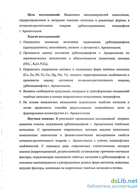 Научная новизна. В результате проведенных исследований впервые выявлена степень загрязнения урболандшафтов г. Архангельска тяжёлыми металлами. С применением современных методов анализа выполнены комплексные химические и физико-химические исследования свойств почвенно-растительного покрова г. Архангельска с учётом ландшафтных особенностей. С помощью ряда современных статистических методов анализа (корреляционный, регрессионный) установлены причинно-значимые факторы, определяющие накопление тяжёлых металлов в урболандшафтах и основные закономерности в распределении разных форм металлов, выявлены ведущие факторы, влияющие на закрепление тяжёлых металлов в почвах.