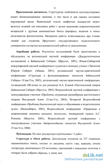 Апробация работы. Результаты исследований были представлены и обсуждались на региональной научной конференции «Дендрологические исследования в Байкальской Сибири» (Иркутск, 2001), Южно-Сибирской международной научной конференции студентов и молодых ученых «Экология Южной Сибири» (Абакан, 2001), региональной научно-практической конференции «Структура и функционирование экосистем Байкальской Сибири» (Улан-Удэ, 2002), региональной научно-практической конференции, посвященной 100-летию со дня рождения Н.А. Еповой «Растительный покров Байкальской Сибири» (Иркутск, 2003), Всероссийской научной конференции с международным участием «Проблемы сохранения разнообразия растительного покрова Внутренней Азии» (Улан-Удэ, 2004), Четвертой Всероссийской конференции «Проблемы биологической науки и образования в педагогических вузах» (Новосибирск, 2005), Всероссийской конференции «Природная и антропогенная динамика наземных экосистем», посвященной памяти А.С. Рожкова (Иркутск, 2005), Всероссийской научной конференции с международным участием «Биоразнообразие экосистем Внутренней Азии» (Улан-Удэ, 2006).