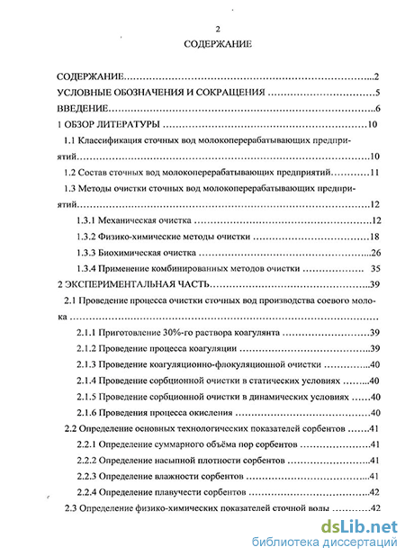 Во введении указывается актуальность темы и даётся общая характеристика диссертации. В первой главе работы приведен обзор литературы по традиционно применяемым методам очистки сточных вод молочного производства. Во второй главе описаны методики проведения экспериментов. Третья глава посвящена обсуждению результатов экспериментов по изысканию оптимальных методов очистки сточных вод производства соевого молока на основе полученных характеристик состава как загрязненных, так и очищенных сточных вод. Четвёртая глава посвящена математической обработке полученных в диссертации экспериментальных данных. В пятой главе произведён расчет эколого-экономического эффекта от внедрения разработанной технологии.