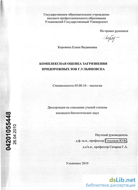 Декларация личного участия автора. Автор лично участвовала в проведении исследований, ею была создана компьютерная база геохимических характеристик почвогрунтов придорожной зоны, проведен количественный анализ этих данных. Написание текста диссертации, формулирование основных теоретических положений и выводов осуществлено по плану, согласованному с научным руководителем. Доля личного участия автора в совместных публикациях пропорциональна числу авторов.