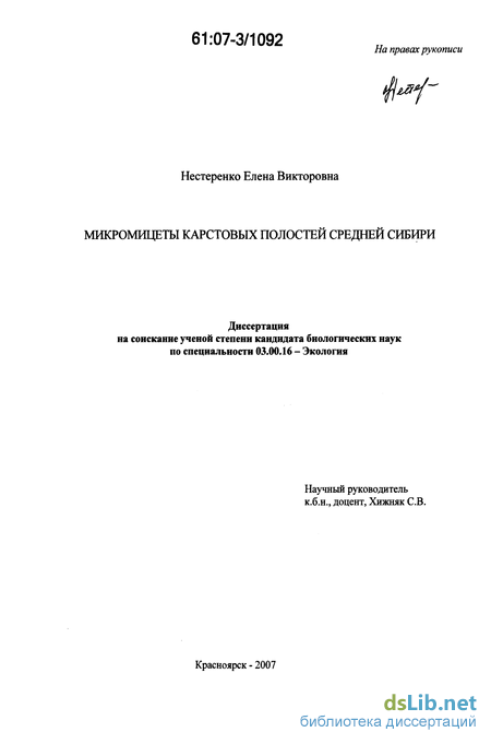 Защищаемые положения: 1. Специфические комплексы микромицетов пещер Средней Сибири, представленные грибами, находятся на разных стадиях эволюционной адаптации к низкотемпературным условиям подземной среды.