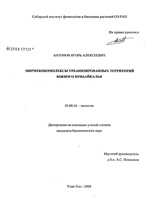 Актуальность темы. Муравьи (Hymenoptera, Formicidae), будучи фоновой группой насекомых в различных типах наземных экосистем, имеют важное и разностороннее биогеоценотическое значение. По своей трофике, проявляя себя как хищники, они ограничивают численность различных, в том числе вредных беспозвоночных, но, с другой стороны, удовлетворяя потребности в сахаристых веществах за счет трофобиоза с тлями и другими сосущими насекомыми-фитофагами, способствуют росту их численности. Большое значение имеет и гнездостроительная деятельность муравьев, ускоряющая почвообразовательные процессы. Некоторые виды муравьев имеют санитарно-эпидемиологическое значение. Все это обусловливает интерес к выяснению особенностей состава и экологического значения муравьев в урбоэкосистемах и к определению общих закономерностей формирования городских мирмекокомплексов (Клауснитцер, 1990; Захаров, Саблин-Яворский, 1998 и др.). Подобные исследования в умеренном поясе Евразии проводились до сих пор главным образом в Восточной Европе и Западной Сибири, преимущественно в городах, расположенных в пределах лесной и лесостепной зон. Восточная Сибирь такими работами была почти не затронута. Практически отсутствовали сведения и о мирмекокомплексах городов, расположенных в иных (не лесных) природных зонах.