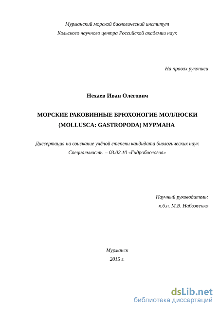 Актуальность работы. Брюхоногие моллюски (Gastropoda) являются одной из самых богатых по числу видов групп животных, представители которой освоили большое число местообитаний на суше, в континентальных водоёмах и в Мировом океане.