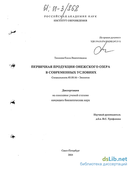 Апробация работы и публикации. Материалы диссертации докладывались и обсуждались на заседаниях Лаборатории гидробиологии и Ученого Совета Института водных проблем Севера КарНЦ РАН (Петрозаводск, 2001, 2002, 2003), Лаборатории гидробиологии Института Озероведения РАН (Санкт-Петербург, 2002, 2003), на Международной конференции молодых ученых и специалистов «Экология — 98» (Архангельск, 1998 г.), на Международной конференции «Проблемы гидроэкологии на рубеже веков» (Санкт-Петербург, 2000 г.). По теме диссертации опубликовано 9 печатных работ, в том числе раздел в монографии «Онежское озеро. Экологические проблемы».