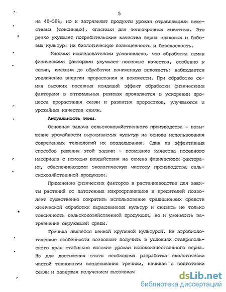 Актуальность темы. Повышение урожайности сельскохозяйственных культур на основе использования современных технологий возделывания -основная задача сельскохозяйственного производства. Эффективным способом решения этой задачи является повышение качества посевного материала с помощью воздействия на семена физическими факторами, обеспечивающими экологическую чистоту производства продукции растениеводства. Применение физических факторов в растениеводстве для защиты растений от патогенных микроорганизмов и вредителей сокращает использование традиционных средств химической обработки и снижает не только токсичность продукции, но и уменьшает загрязнение окружающей среды.