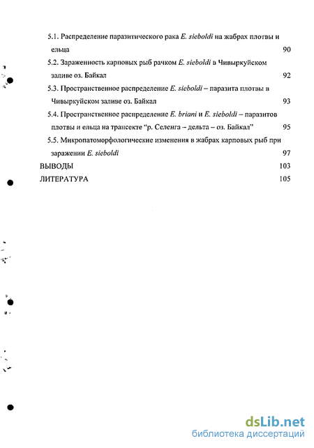 5.1. Распределение паразитического рака Е. sieboldi на жабрах плотвы и ельца 90