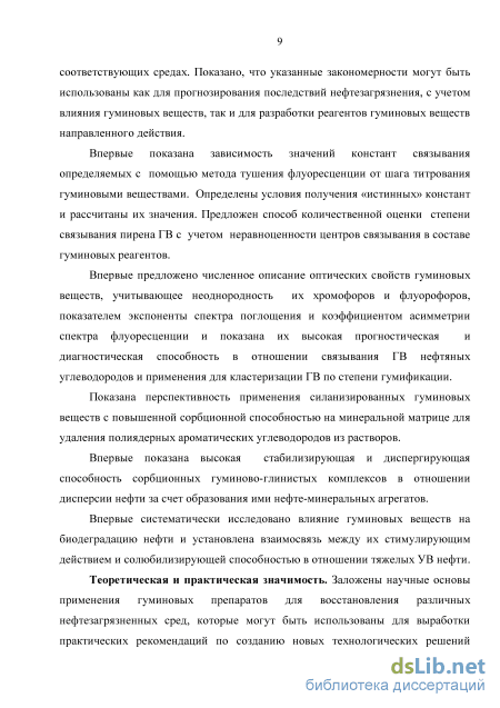Научная новизна. Выполнено систематическое исследование взаимодействия растворенных и иммобилизованных форм гуминовых веществ с нефтяными углеводородами с целью разработки экологически безопасных гуминовых реагентов направленного действия. Выявлено наличие достоверных взаимосвязей между строением, оптическими свойствами гуминовых веществ и их эффективностью в составе гуминовых реагентов в отношении связывания, диспергирования и/или стимулирования деградации нефтяного загрязнения в соответствующих средах. Показано, что указанные закономерности могут быть использованы как для прогнозирования последствий нефтезагрязнения, с учетом влияния гуминовых веществ, так и для разработки реагентов гуминовых веществ направленного действия.