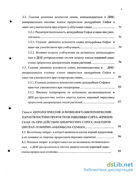 3-2. Годовая динамика всхожести семян, антиоксидантные и ДНК- репарационные системы клеток проростков дескурайнии Софьи и иван-чая узколистного при остром у-облучении семян 71