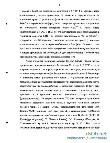 Как отмечает ведущий отечественный исследователь гуминовых веществ Д.С.Орлов: «На планете Земля общее количество органического углерода в биосфере оценивается величиной 2-3 " 1012 т. Большая часть органического углерода приходится на сушу, и в первую очередь на почвенный гумус. В результате фотосинтеза ежегодно связывается около 5x1010 т углерода из атмосферы, а при отмирании организмов в виде опада на поверхность почвы поступает около 4х1010 т. Часть опада минерализуется до С02 и НгО, но его значительная доля превращается в гуминовые вещества (ГВ) - по разным источникам, от 0,6 до 2,5x109 т углерода в год. Образование гуминовых веществ не просто утилизация органических остатков, которая необходима в биосфере. Важнее то, что при этом возникает новый класс природных соединений, не существующих в живых организмах, но необходимых для существования и обеспечения непрерывности современных жизненных форм» [67].