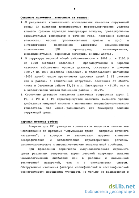 В результате проведённых исследований выявлен ряд факторов, способствующих снижению иммунологической и неспецифической резистентности детского организма в регионе Республики Карелия: негативные особенности климата, нарастающее антропогенное загрязнение воздушного бассейна и др. Это обуславливает необходимость разработки комплекса профилактических мероприятий, направленных на устранение данных негативных воздействий.
