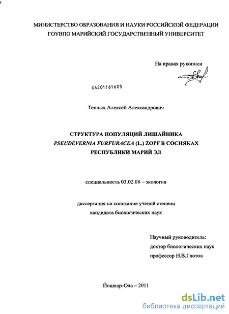 Апробация работы. Результаты диссертации были доложены на Межрегиональной научно-практической конференции «Проблемы экологии и природопользования в бассейнах рек Республики Марий Эл и сопредельных регионов» (Йошкар-Ола, 2006), на II Всероссийской научной конференции «Принципы и способы сохранения биоразнообразия» (Йошкар-Ола, 2006), на научной конференции преподавателей МарГУ по итогам научно-исследовательской работы (Йошкар-Ола, 2006), на IX Всероссийском популяционном семинаре (Уфа, 2006), на Всероссийской конференции молодых ученых «Экология: от Арктики до Антарктики» (Екатеринбург, 2007), на Международном совещании «Лишайники бореальных лесов» (Сыктывкар, 2008).