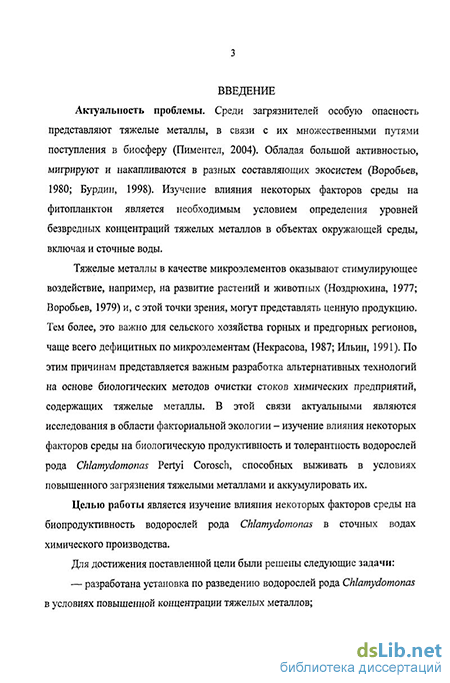 Тяжелые металлы в качестве микроэлементов оказывают стимулирующее воздействие например на развитие растений и животных (Ноздргохина, 1977, Воробьев, 1979) и, с этой точки зрения, могу г представлять ценную продукцию Тем более, это важно для сельского хозяйства горных и предгорных регионов чаще всего дефицитных ро микроэлементам (Некрасова, 1987, Ильин, 199!) По этим причинам представляется важным разработка альтернативных техночогий на основе биологических методов очистки стоков химических предприятий, содержащих тяжелые метатлы В этой связи актуальными являются исследования в области факториальной экологии — изучение влияния некоторых факторов среды на биологическую продуктивность и толерантность водорослей рода Chlamydornonas, способных выживать в условиях повышенного загрязнения тяжелыми металлами и аккумулировать их