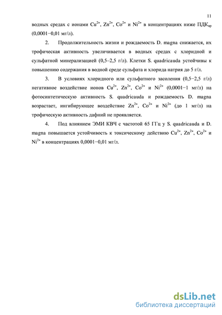 5) В условиях хлоридной и сульфатной засоленности ингибирующее воздействие ТМ на трофическую активность дафний не проявлялось, т.е. трофическая активность Daphnia magna не является оптимальным биопараметром для оценки токсичности водной среды.