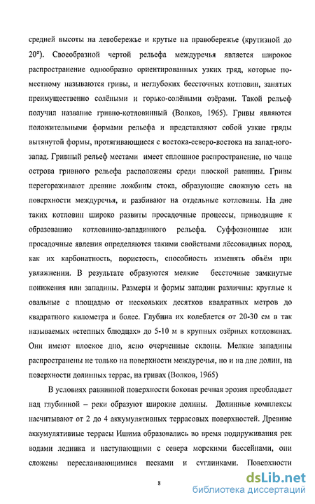 В условиях равнинной поверхности боковая речная эрозия преобладает над глубинной - реки образуют широкие долины. Долинные комплексы насчитывают от 2 до 4 аккумулятивных террасовых поверхностей. Древние аккумулятивные террасы Ишима образовались во время подпруживания рек водами ледника и наступающими с севера морскими бассейнами, они сложены переслаивающимися песками и суглинками. Поверхности надпойменных террас обычно выровненные, слаборасчленённые, осложнённые гривами и межгривными понижениями.