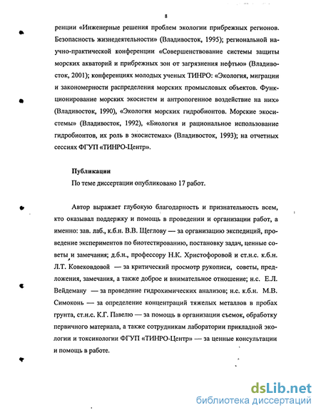 ^Результаты работы представлялись и докладывались на международных конференциях «Оценка расположенных на суше источников загрязнения морей, омывающих государства СНГ» (Севастополь, 1992), «Северная Пацифика, охрана окружающей среды, география» (Владивосток, 1994); «Человек в прибрежной зоне: опыт веков» (Петропавловск-Камчатский, 2001), «Рациональное природопользование и управление морскими биоресурсами: экосистемный подход» (Владивосток, 2003); XII конференции «PICES» (Seoul, 2003); 2-й Всесоюзной конференции по рыбохозяйствен-ной токсикологии (Санкт-Петербург, 1991); Всесоюзной конференции «Экосистемы морей России в условиях антропогенного пресса (включая промысел)» (Астрахань, 1994); 2-й тихоокеанской экологической конфе-