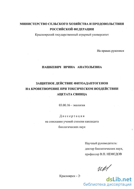 Пашкевич Ирина Анатольевна. Защитное действие фитоадаптогенов на кроветворение при токсическом воздействии ацетата свинца : диссертация ... кандидата биологических наук : 03.00.16.- Красноярск, 2002.- 100 с.: ил. РГБ ОД, 61 03-3/66-0