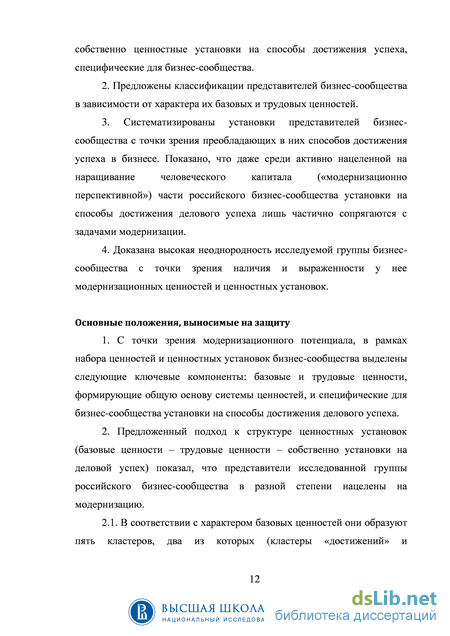 Целью диссертационного исследования является выявление структуры ценностей и ценностных установок представителей российского бизнес- сообщества с точки зрения их модернизационного потенциала.