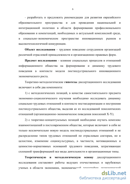Предмет исследования – влияние социальных процессов и отношений информационного общества на формирование и динамику трудового поведения в контексте модели инновационного экономического роста.