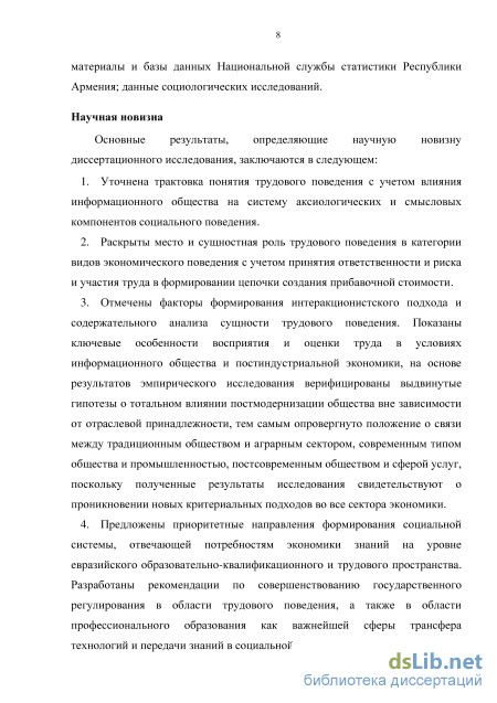 Научная новизна результатов диссертационной работы состоит в уточнении социологического концептуального подхода к изучению трудового поведения в условиях постмодернизации общества и формирования постиндустриального экономического поведения.