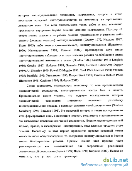 институционализма, поддерживаемая группой московских ученых во главе с Радаевым (Радаев 2001), хотя коллектив новосибирских исследователей продолжает держать курс на социологическую ориентацию (Бессонова 1997; Кирдина 2000).