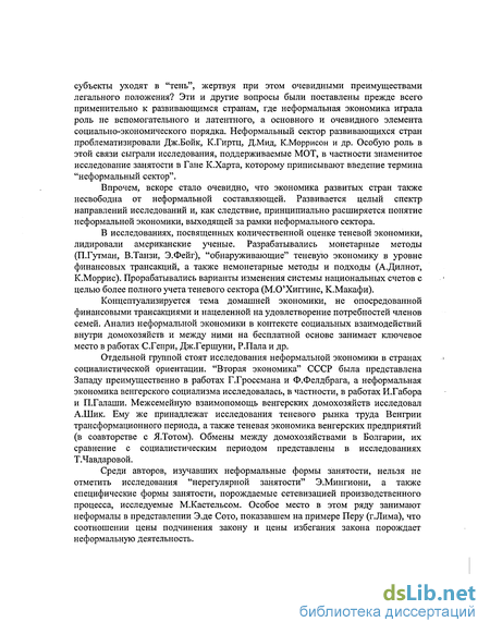 Но не только вопросы занятости привлекают исследователей. Теневая экономика предприятий представлена в схемах бартера А.Леденевой, в схемах неучтенного наличного оборота А.Яковлевым, в раскладах трансакционных издержек В.Радаевым, в моделях хозяйствования реального сектора Т.Долгопятовой, в сетевых структурах современного российского бизнеса С.Авдашевой. Процессы теневизации экономики ВПК и силовых ведомств изучаются Р.Рывкиной и Л.Косалсом, а медицинской сферы - И.Козиной. Неформальный аспект трудовых отношений на постсоветских предприятиях выявляют С.Алашеев, В.Кабалина, С.Кларк, П.Романов и др. Тенденции развития теневой и криминальной экономик в контексте процесса глобализации исследует С.Глинкина.
