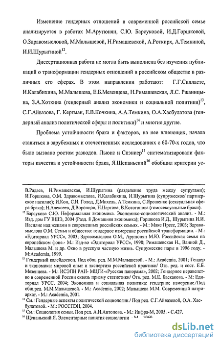 Изменение тендерных отношений в современной российской семье анализируется в работах М.Арутюнян, СЮ. Барсуковой, И.Д.Горшковой, О.Здравомысловой, М.Малышевой, Н.Римашевской, А.Роткирх, А.Темкиной, И.И.Шурыгиной12.