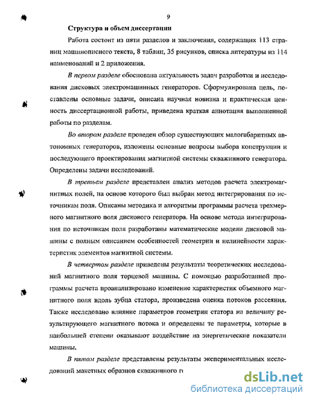 Целью диссертационной работы является разработка и исследование электромашинного синхронного генератора дисковой конструкции, предназначенного для электропитания скважинного прибора. В связи с этим решаются следующие задачи: