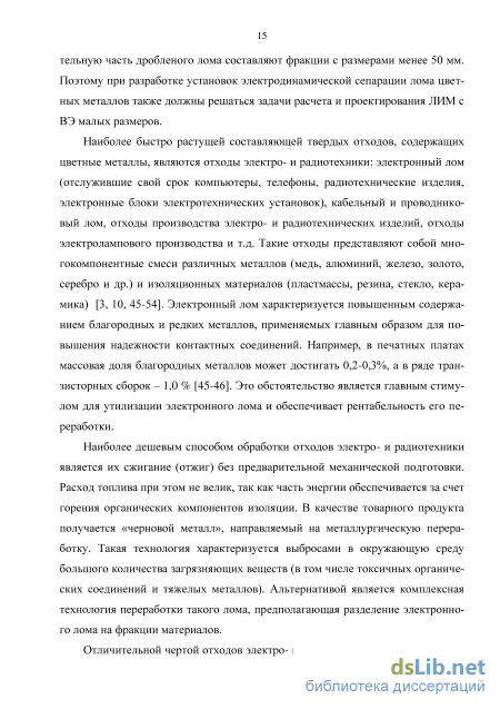 Наиболее быстро растущей составляющей твердых отходов, содержащих цветные металлы, являются отходы электро- и радиотехники: электронный лом (отслужившие свой срок компьютеры, телефоны, радиотехнические изделия, электронные блоки электротехнических установок), кабельный и проводниковый лом, отходы производства электро- и радиотехнических изделий, отходы электролампового производства и т.д. Такие отходы представляют собой многокомпонентные смеси различных металлов (медь, алюминий, железо, золото, серебро и др.) и изоляционных материалов (пластмассы, резина, стекло, керамика) [3, 10, 45-54]. Электронный лом характеризуется повышенным содержанием благородных и редких металлов, применяемых главным образом для повышения надежности контактных соединений. Например, в печатных платах массовая доля благородных металлов может достигать 0,2-0,3%, а в ряде транзисторных сборок – 1,0 % [45-46]. Это обстоятельство является главным стимулом для утилизации электронного лома и обеспечивает рентабельность его переработки.