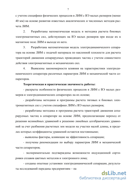 Для достижения данной цели решались следующие исследовательские задачи: разработка математических моделей и методик расчета как ЛИМ, так и электродинамического сепаратора в целом; выявление закономерностей протекания электромагнитных процессов в ЛИМ с малыми размерами ВЭ (менее 40 мм) и развитие теории таких машин; анализ факторов, влияющих на эффективность сепарации, при рассмотрении электродинамического сепаратора как электромеханической системы; разработка рекомендаций по проектированию и эксплуатации рассматриваемых сепараторов, а также апробация результатов исследований на опытных образцах.