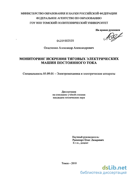Целью диссертационной работы является создание системы мониторинга коммутационного состояния ТЭД в период эксплуатации на основе программной обработки информации и приборной оценки искрения коллекторно-щеточного узла.