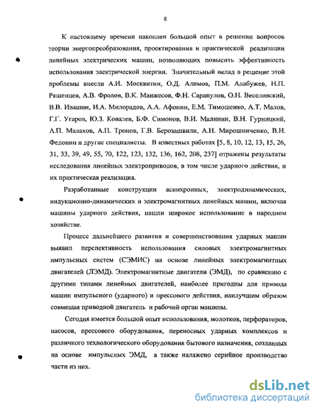К настоящему времени накоплен большой опыт в решении вопросов теории энергопреобразования, проектирования и практической реализации линейных электрических машин, позволяющих повысить эффективность использования электрической энергии. Значительный вклад в решение этой проблемы внесли А.И. Москвитин, О.Д. Алимов, П.М. Алабужев, Н.П. Ряшенцев, А.В. Фролов, В.К. Манжесов, Ф.Н. Сарапулов, О.Н. Веселовский, В.В. Ивашин, И.А. Милорадов, А.А. Афонин, Е.М. Тимошенко, А.Т. Малов, Г.Г. Угаров, Ю.З. Ковалев, Б.Ф. Симонов, В.И. Малинин, В.Н. Гурницкий, А.П. Малахов, А.П. Тронов, Г.В. Берозашвили, А.Н. Мирошниченко, В.Н. Федонин и другие специалисты. В известных работах [5, 8, 10,12, 13,15, 26, 31, 33, 39, 49, 55, 70, 122, 123, 132, 136, 162, 208, 237] отражены результаты исследования линейных электроприводов, в том числе ударного действия, и их практическая реализация.
