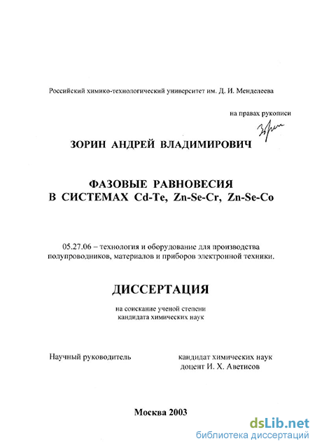 Зорин Андрей Владимирович. Фазовые равновесия в системах Cd-Te, Zn-Se-Cr, Zn-Se-Co : диссертация ... кандидата химических наук : 05.27.06.- Москва, 2003.- 163 с.: ил. РГБ ОД, 61 03-2/405-X