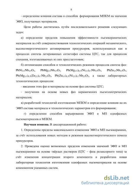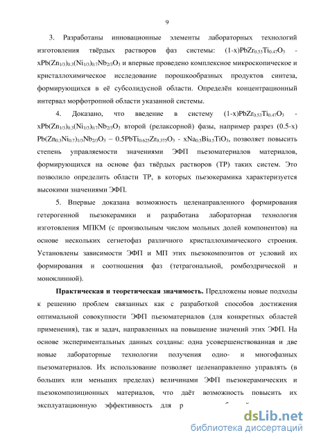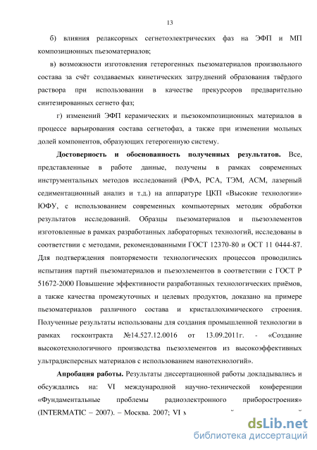 седиментационный анализ и т.д.) на аппаратуре ЦКП «Высокие технологии» ЮФУ, с использованием современных компьютерных методик обработки результатов исследований. Образцы пьезоматериалов и пьезоэлементов изготовленные в рамках разработанных лабораторных технологий, исследованы в соответствии с методами, рекомендованными ГОСТ 12370-80 и ОСТ 11 0444-87. Для подтверждения повторяемости технологических процессов проводились испытания партий пьезоматериалов и пьезоэлементов в соответствии с ГОСТ Р 51672-2000. Повышение эффективности разработанных технологических приёмов, а также качества промежуточных и целевых продуктов, доказано на примере пьезоматериалов различного состава и кристаллохимического строения.