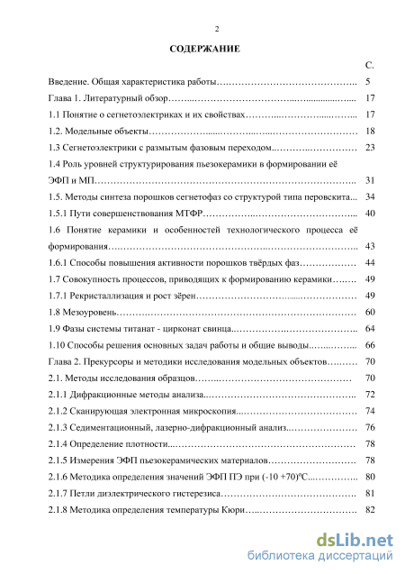 Сегнетоэлектрическое состояние системы непосредственно не связано с составом кристаллической фазы, а наблюдается только у нецентросимметричных полиморфных модификаций определённого качественного и количественного состава. В связи с этим для материалов фиксированного состава Ps сохраняется только в пределах определённого температурного интервала, вне которого термодинамически стабильными будут центросимметричные парафазы. Переход (сегнето- парафаза) может представлять собой фазовый переход (ФП) первого или второго рода, а температура, при которой происходит превращение одной полиморфной модификации в другую, называется температурой (точкой) Кюри [1, 2]. На основе СЭФ формируются сегнетоэлектрические (СЭМ) и пьезоэлектрические (ПЭМ) материалы, находящие применение в различных областях современной науки и техники. В настоящее время описано более 700 нецентросимметричных СФ, из которых около 50 нашли практическое применение [3]. Все современные пьезокерамические материалы можно разделить на шесть основных типов: 1. Материалы на основе титанат бария ВаТiО3 (ТБ) характеризуются средними диэлектрическими параметрами и небольшими величинами основных пьезохарактеристик. 2. Материалы на основе метаниобата свинца. Так как эта фаза двухосна, практический интерес представляют только пьезотекстуры на её основе, которые хотя и характеризуются высокой анизотропией продольной и поперечной пьезоактивности, однако абсолютные значения пьезомодулей материалов невелико на фоне низких значений механической добротности. 3. Материалы на основе низколегированного титаната свинца характеризуются низкими значениями диэлектрической проницаемости при средних значениях пьезопараметров. 4. Материалы на основе слоистых висмут-титанатов имеют высокие рабочие температуры (до 8500С) при низкой пьезоактивности. 5. Материалы на основе метаниобатов натрия и калия характеризуются низкой плотностью, высокой скоростью звука, повышенной механической добротностью, но по ЭФП уступают материалам на основе фаз системы PbTiО3 РbZrО3 (ЦТС), а некоторые – даже титанату свинца. Кроме этого их практическое использование затруднено в связи с высокой гигроскопичностью материалов. 6. К числу наиболее перспективных СЭМ относятся керамические пьезоматериалы на основе фаз системы ЦТС. Они представляют собой твёрдые растворы системы цирконат-титаната свинца (PbTiО3 - РbZrО3) и являются основой значительной части современных пьезоэлектрических материалов с различным сочетанием ЭФП.