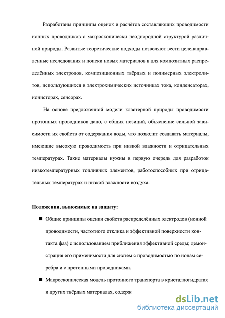 Применение перколяционной теории к системам с быстрым ионным переносом предложено автором одним из первых, также все теоретические подходы и интерпретация экспериментальных результатов выполнены им лично. Вкладом автора является также постановка экспериментальных измерений и обработка их результатов. Экспериментальные измерения проводимости композитных проводников с Ag4RbI5 проведены совместно с Н.Г. Букун и А.М. Вакуленко, с протонной проводимостью – совместно с Л.С. Леоновой и Д.И. Домашневым, исследования систем с агрегацией частиц проведены частично с Л.С.Леоновой, Джао Цзинь и А.В. Чубом, макроструктуры солей гетерополикислот исследованы совместно с А.И. Чикиным и А.В. Черняком, измерения протонной проводимости сульфокислот проведены совместно с А.В. Писаревой и Л.В. Шмыглёвой.