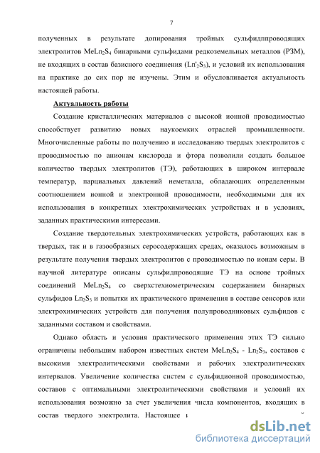 ТЭ с проводимостью по ионам серы находят применение в качестве сенсоров для анализа серосодержащих газовых сред, ионоселективных мембран для получения полупроводниковых сульфидов контролируемого состава, а также в электрохимических устройствах для исследования термодинамики и кинетики различных процессов. Они перспективны как электролиты литий-серных источников тока, превосходящих в несколько раз традиционные литий-ионные аккумуляторы по удельной плотности энергии. Но все же электролиты с проводимостью по ионам серы в настоящее время исследованы недостаточно. В научной литературе описаны сульфидпроводящие твердые электролиты на основе тройных соединений MeLn2S4 (Me = Са, Ва; Ln = Nd, Sm, Y, Pr, Gd, Tm) со сверхстехиометрическим содержанием бинарных сульфидов L112S3. Однако область и условия их практического применения ограничены небольшим набором составов с высокими электролитическими свойствами.