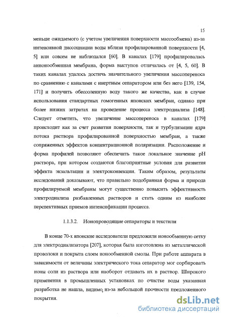 Исследования показали, что при профилировании поверхности форма, расположение выступов и природа профилируемой мембраны значительным образом влияют на интенсивность массопереноса. Так в каналах, образованных стандартными анионообменными мембранами и профилированными катионообменными (профилирование заключалось в создании на поверхности мембраны выступов в виде полос треугольного или трапециевидного сечения) [4, 5, 60], удалось достичь превышения коэффициента массопереноса над его значением в каналах той же геометрии с гладкими мембранами. Но при токах близких к предельному и превышающих его прирост массопереноса в разбавленных растворах был меньше ожидаемого (с учетом увеличения поверхности массообмена) из-за интенсивной диссоциации воды вблизи профилированной поверхности [4, 5] или совсем не наблюдался [60]. В каналах [179] профилировалась анионообменная мембрана, форма выступов отличалась от [4, 5, 60]. В таких каналах удалось достичь значительного увеличения массопереноса по сравнению с каналами с инертным сепаратором или без него [139, 154, 171] и получить обессоленную воду такого же качества, как в случае использования стандартных гомогенных японских мембран, однако при более низких затратах на проведение процесса электродиализа [148]. Следует отметить, что увеличение массопереноса в каналах [179] происходит как за счет развития поверхности, так и турбулизации ядра потока раствора профилированной поверхностью мембран, а также сопряженных эффектов концентрационной поляризации. Расположение и форма профилей позволяют обеспечить такое локальное значение рН раствора, при котором создаются благоприятные условия для развития эффекта экзальтации и электроконвекции. Таким образом, результаты исследований доказывают, что правильно подобранная форма и природа профилируемой мембраны могут существенно повысить эффективность электродиализа разбавленных растворов и стать одним из наиболее перспективных приемов интенсификации процесса.