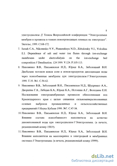 Апробация работы. Материалы диссертации обсуждались на Российских конференциях по мембранам и мембранным технологиям «Мембраны-95» и «Мембраны-98» (г.Москва, 1995, 1998 гг.); Всероссийских химических днях (ХиД-98) (г.Красноярск, 1998 г.); Всероссийской конференции «Электрохимия мембран и процессы в тонких ионо-проводящих пленках на электродах» (г.Энгельс, 1999 г.); Международном конгрессе «Мембраны и мембранные процессы» (ICOM' 96) (Япония, 1996 г.); Международной конференции «European conference on desalination and environment» (г.Лас Пальмас, Канарские острова, Испания, 1999 г.), а также на ежегодных конференциях по мембранной электрохимии «Ионообменные мембраны от синтеза к применению» (г.Краснодар, 1995-99 гг.).